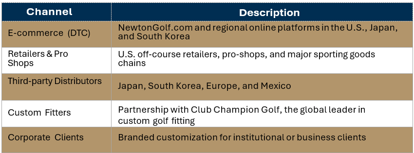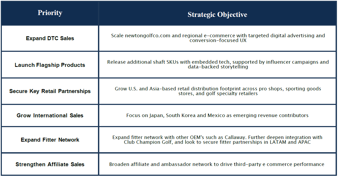 Newton Golf’s near-term strategy focuses on channel expansion, product visibility, and early-stage international scaling, supported by its recent capital raises and vertically integrated manufacturing platform.
