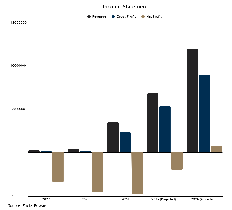 From 2022 to 2024, the company demonstrated exceptional growth, with revenue rising from $190K to $3.45M. Gross profit followed the same trajectory, increasing from $80K to $2.3M, while margins strengthened significantly from 42% in 2022 to 66% in 2024. This reflects the company’s ability to scale while simultaneously improving efficiency and cost management. Looking ahead, by 2026 (projected) the business is expected to generate $12M in revenue and $9M in gross profit, translating into margins close to 75%. This progression underscores a clear path from early-stage growth to large-scale operations, with profitability firmly in sight.