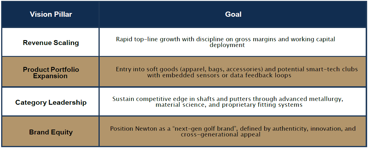 Looking out over a 3–5 year horizon, Newton aims to become a category-defining performance golf brand, with a scaled global footprint and diversified product mix.